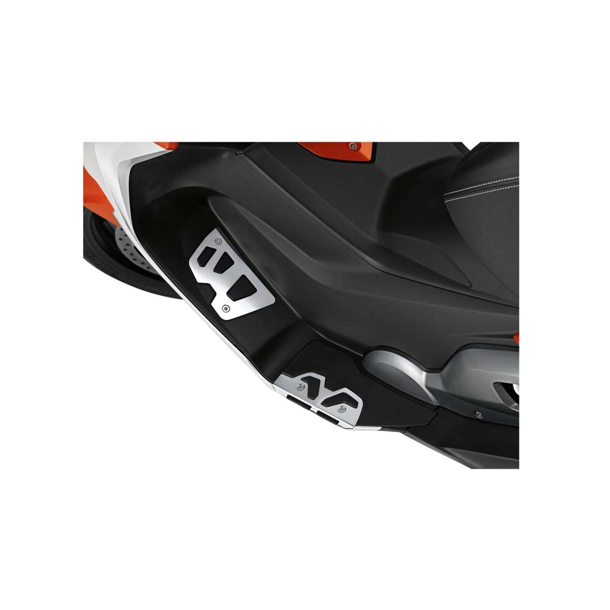 Der verchromte Trittbretteinsatz Mitte, links setzt einen edlen Styling-Akzent und unterstreicht so den individuellen Look des Maxi-Scooters.