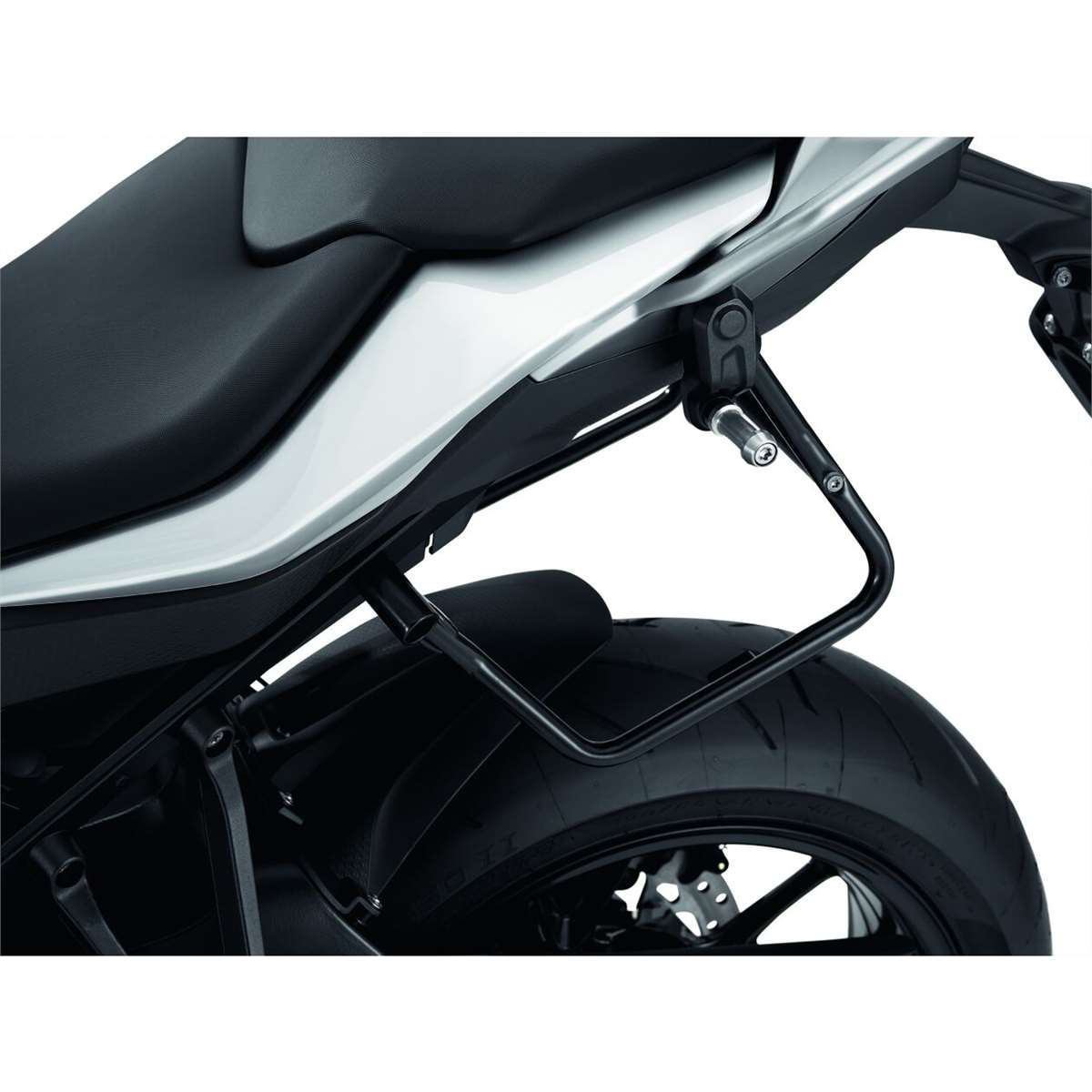 Am stabilen Kofferhalter aus schwarz lackiertem Stahl lässt sich der Tourenkoffer linksseitig leicht und sicher befestigen.