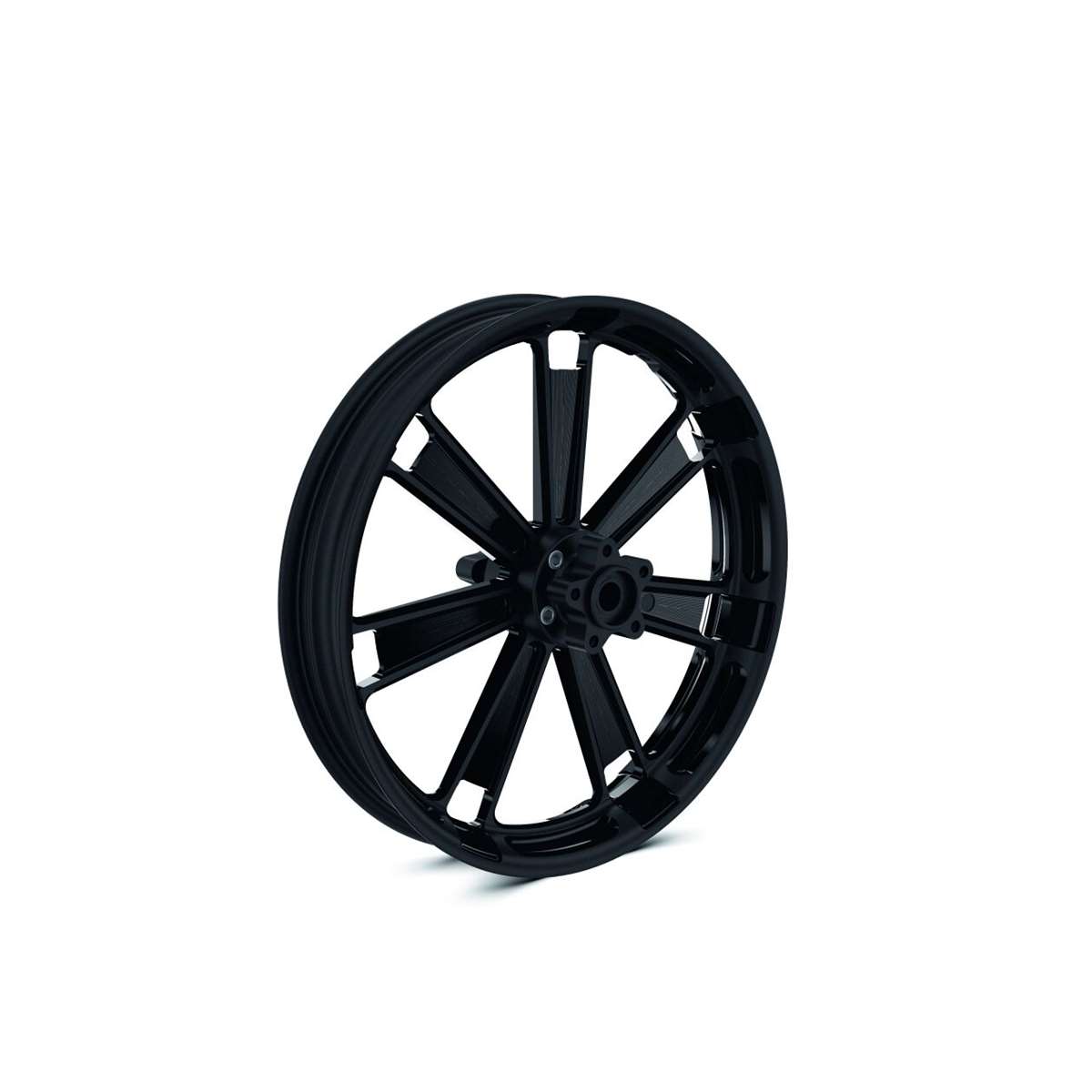 Das hochwertige Vorderrad 2-Tone-Black aus Aluminium präsentiert sich in einer exklusiven Bicolor-Optik mit attraktiver Kontrastfräsung in Schwarz matt und Schwarz glänzend. Die aufwendige Oberflächenbehandlung mit detaillierten Fräskonturen verleiht dem Vorderrad einen dynamischen Charakter und rundet den Custom-Look der Maschine perfekt ab.
